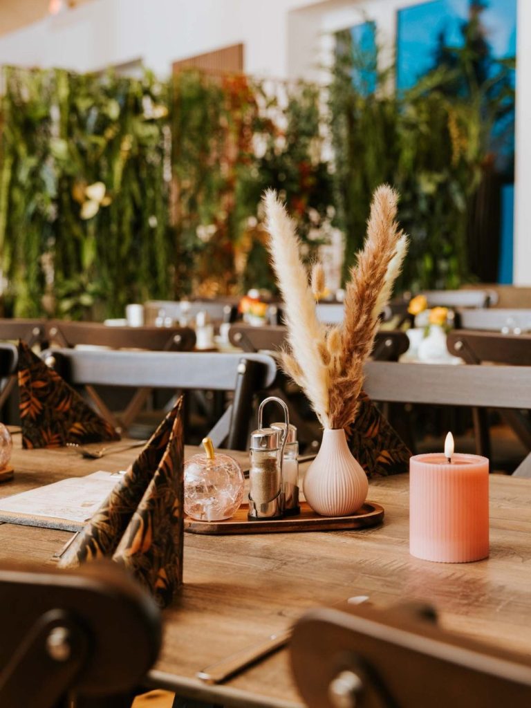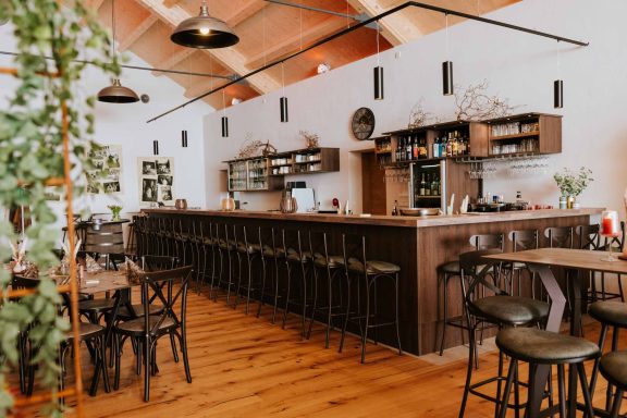 Der großzügige Saal beeindruckt mit seiner offenen Holzdeckenkonstruktion, sichtbaren Lüftungselementen und stilvollen Pendelleuchten. Diese Kombination verleiht dem Raum Weite, Eleganz und eine ganz besondere Atmosphäre. Der helle Holzboden, geschmackvolle Möblierung und liebevoll ausgewählte Details sorgen für ein Ambiente, das zugleich einladend und gemütlich warm ist.