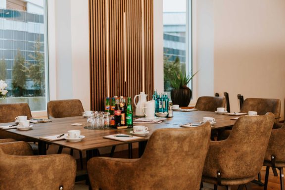 - Tagungsbestuhlung: Tische mit Stühlen dahinter auf Anfrage