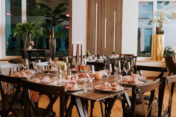 Ob festlich gedeckte Tafeln, kreative Dekorationskonzepte oder individuelle Bestuhlungsvarianten – der Raum lässt sich flexibel an Ihr persönliches Eventkonzept anpassen. Große Fensterfronten und harmonisch gesetzte Lichtakzente schaffen eine angenehme, lichtdurchflutete Stimmung, die sowohl tagsüber als auch abends begeistert.